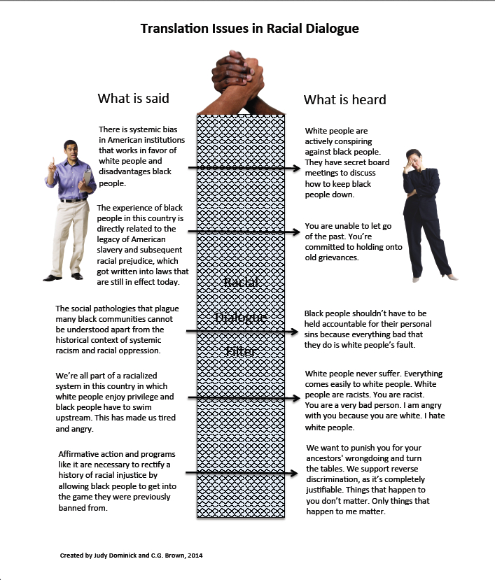 If we don’t first grasp the concept that we have a culture that shapes our thought processes and that the people we are talking to also have a culture that shapes theirs, then miscommunication and misunderstanding are virtually guaranteed outcomes. When people of different cultures come together to converse about race – particularly after a racially charged incident – each group brings its own set of emotionally charged and heavily freighted language and ideas, all of which have been formed out of a rich history of unique life experiences; but before any of it has a chance to get adequately unpacked, conversation quickly degenerates into anger, mutual accusations, and finally, with each group dismissing the other in disgust as unreformable. We need better tools of communication and fundamentally more receptive postures toward one another.