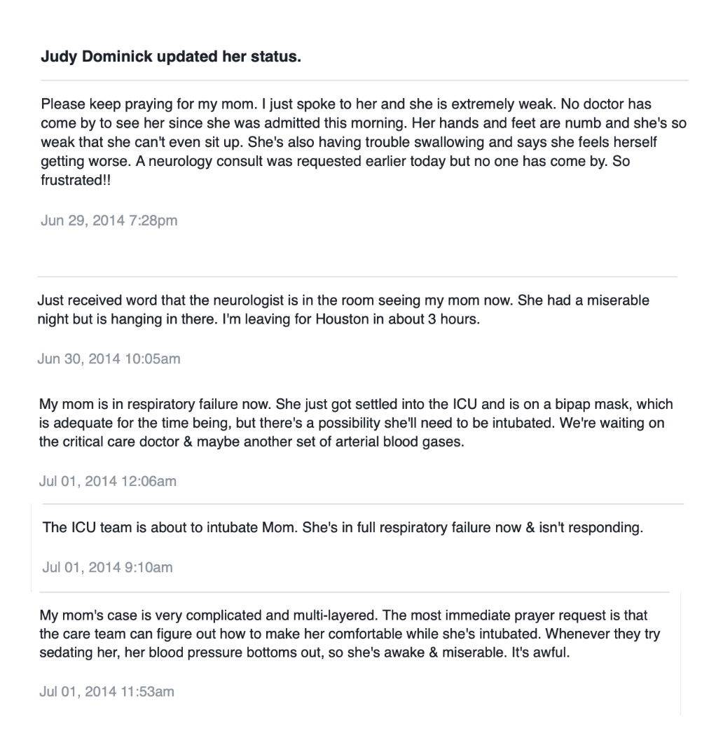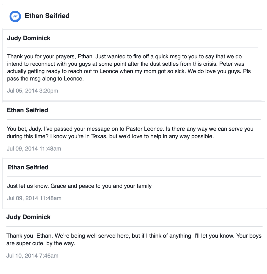 On June 29, 2014, my mother became critically ill. I flew to Houston the next day to see her. Here’s a series of updates I posted to Facebook when she was admitted to the hospital. (Click here for Alt text.) Ethan saw my updates and commented on one of them that he was praying for us. We continued the conversation in private messages. (Click here for Alt text.) Basically, he offered support; I told him that Peter and I would reach out to him and Léonce after the dust settled from our current crisis; and he indicated that he had passed along the message to Léonce.