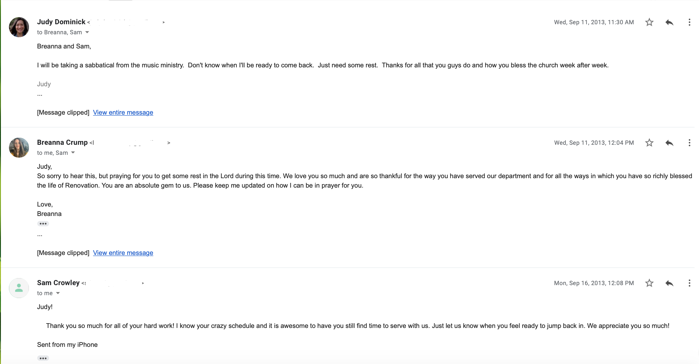 I became increasingly marginalized and without a voice on the worship team. At some point in the summer of 2013, I realized that Breanna Crump (worship director/co-leader and Léonce’s wife) had stopped sending me worship team scheduling emails, and I fell off the rotation altogether. I eventually had a face-to-face conversation about all this with Breanna on November 26, 2013 and then exchanged a series of detailed emails with Sam between December 8-9, 2013. Those interactions were cordial but ultimately proved to be unproductive. The content of those emails can be accessed here.