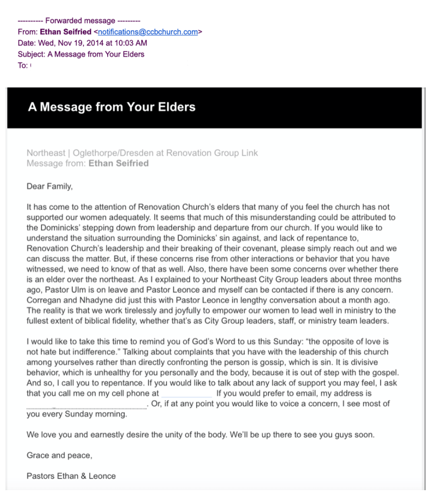Ethan came over to our home on Saturday, March 23, 2019. He surprised us with the news that he was no longer at Renovation. He said that he was sorry for any and all the ways that he had sinned against us during his time at Renovation, sorry for perpetuating a toxic culture there, and sorry it had taken him so long to apologize. We talked about the email he and Léonce sent on November 19, 2014 to the city group and how it made us feel. He said, “I’m so sorry.” We asked him what had prompted it. He said he honestly didn’t remember, only that he and Léonce had written it together after something had made Léonce angry, and Ethan apologized for that too – how easy it had been to make damaging public accusations about us and yet not be able to recollect what had even prompted it. We also talked about other incidences, which he summarized as, “We were a**holes. It was a lot of the strong crushing the weak. It just took me a while to recognize it.”
